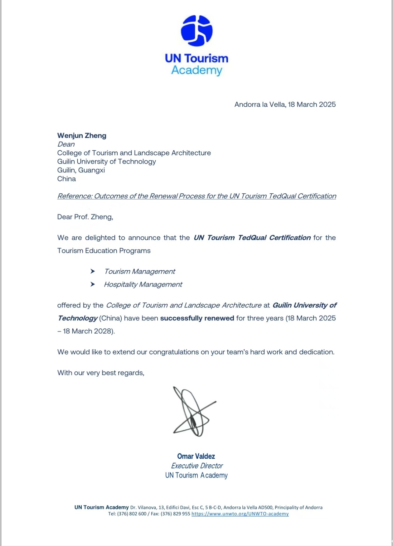 近日,从联合国旅游组织(UN Tourism)西班牙总部发来邮件,确认我校旅游管理、酒店管理专业正式通过“联合国旅游组织TedQual教育质量认证”(UN Tourism TedQual)续认证,认证有效期延续三年(2025年3月至2028年3月)。“联合国旅游组织TedQual教育质量认...