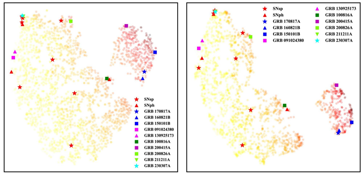 图1: 费米卫星观测到的伽马暴的分类结果,分别基于t-SNE(左图)和 UMAP两种方法(右图)。